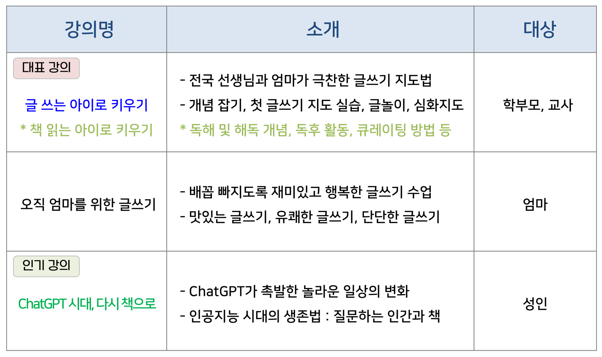 인생2막을 담아낸 [질문하는 힘], 육아의 고단함과 의미를 풀어낸 [아이 셋 키우는남자], 엄마의 삶과 일상인문학을 다룬 [엄마의 글쓰기], 큰 아들과 함께 4년간 글을 쓴 과정을 담은 [초등 글쓰기 비밀수업] 등은 모두 저의 삶으로 빚어낸 책이기 때문입니다. 누구보다 글쓰기의 힘을 잘 압니다.